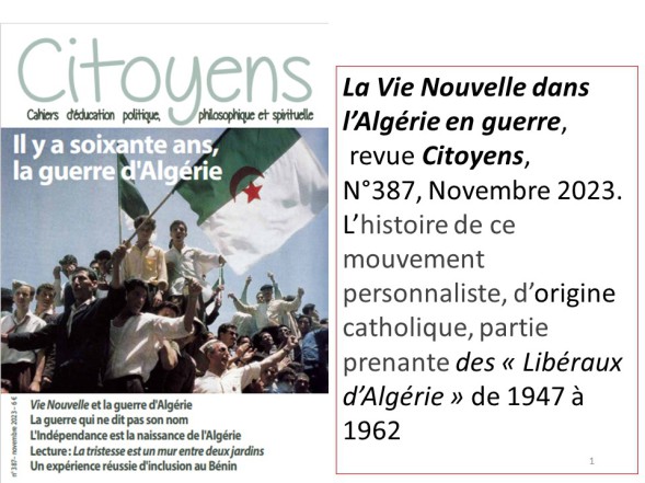 Conférence élargissant l’article La Vie Nouvelle et l’Algérie en guerre, dans Citoyens (revue de La Vie Nouvelle), n° 387, Novembre 2023